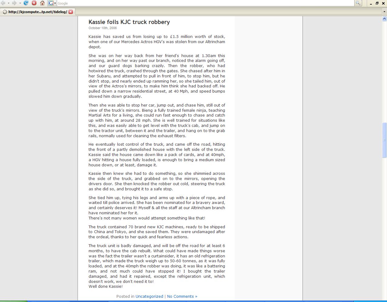 Did you single handedly foil the plan to steal £1.5million worth of KJ Crap from a truck?miss hellfire wrote:Just remember your opponant is only as strong as their weakest point. I do martial arts but don't compete because apparently i'm too vicious for competetive fighting, but not vicious enough for cage fighting. I think i'll just stick to steet fighting.